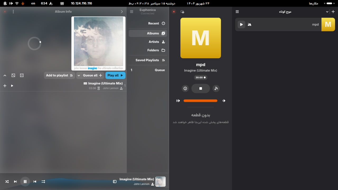 systemctl enable --user --now mpdو سپسsystemctl start --user --now mpdمیتونی سرویسش رو فعال کنید تا همیشه روشن باقی بمونه. مهم اینه با پرچم کاربر اجرا بشه تا mpd بتونه دسترسی داشته باشه به خروجی تعریف شده وگرنه با خطا مواجه میشه.